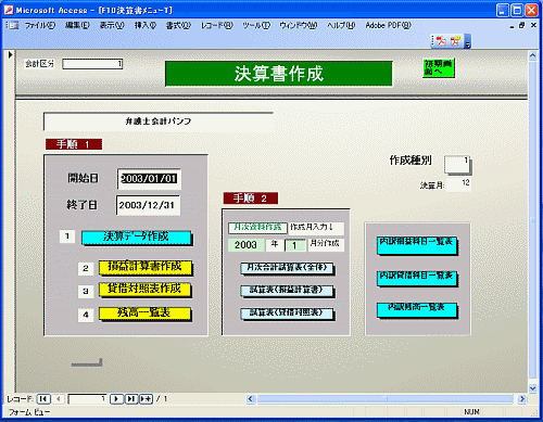 月別に1年分を、即座に作成します。だから、どの月の修正を入れても大丈夫です。 損益計算書、貸借対照表、残高表を、月別推移表形式で作成。 申告に必要な数字が作成されます。