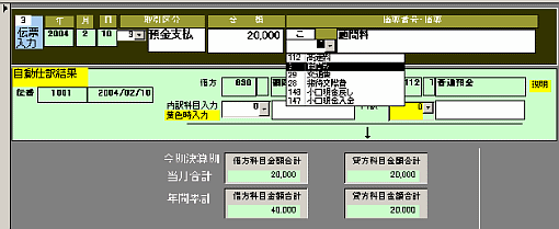 摘要から、例えば、顧問料支払を選択するだけで、自動仕訳されます。 科目の当月合計、年度累計が瞬時に確認参照できます。
